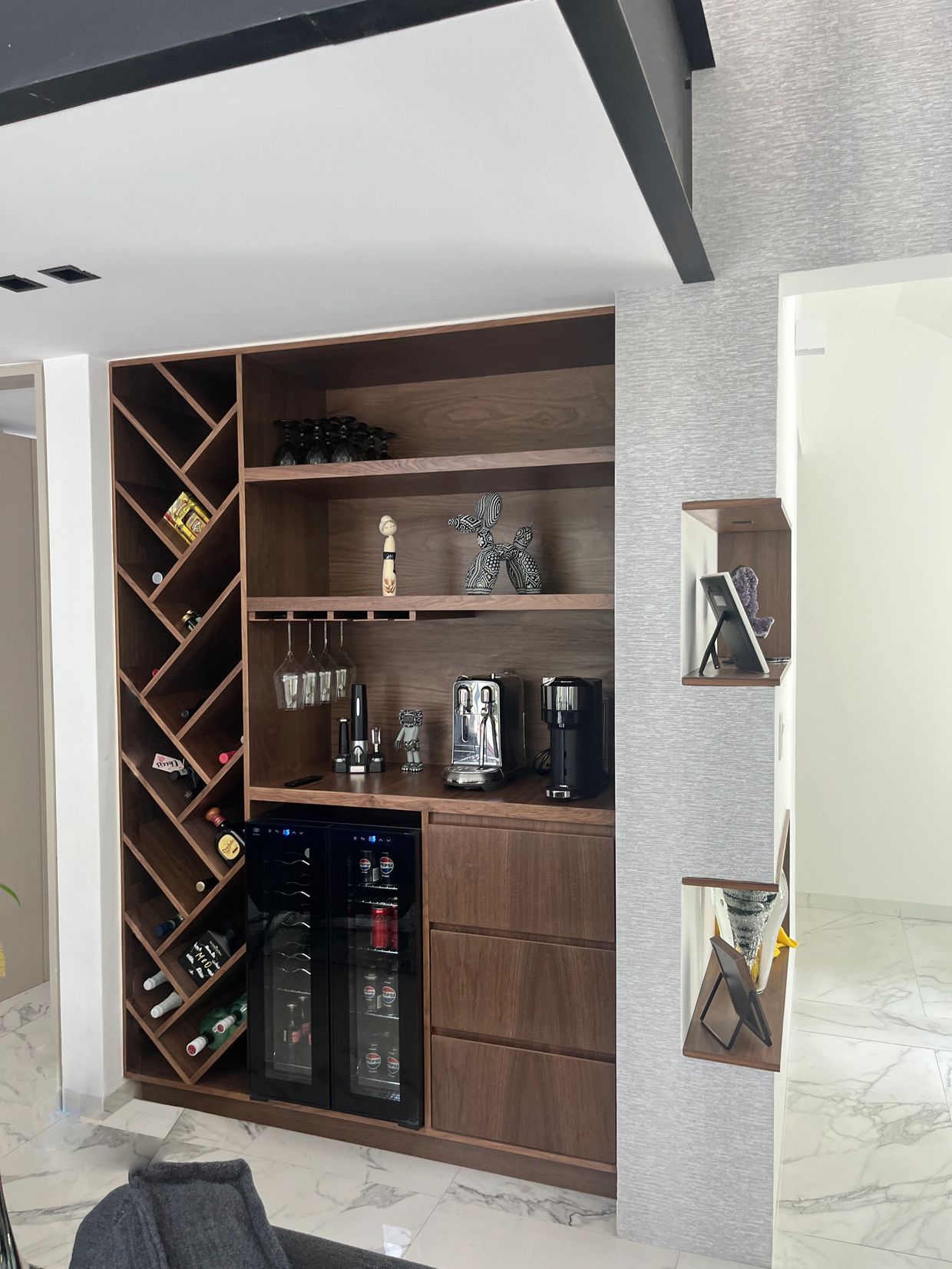 Este mueble de café con cava combina funcionalidad y elegancia en una sola pieza. Diseñado para los amantes del buen café y el vino, integra espacios específicos para cafetera, almacenamiento de tazas, y una cava para botellas. Su acabado en tonos cálidos de madera lo convierten en un acento moderno ideal para cocinas o salas de estar.
