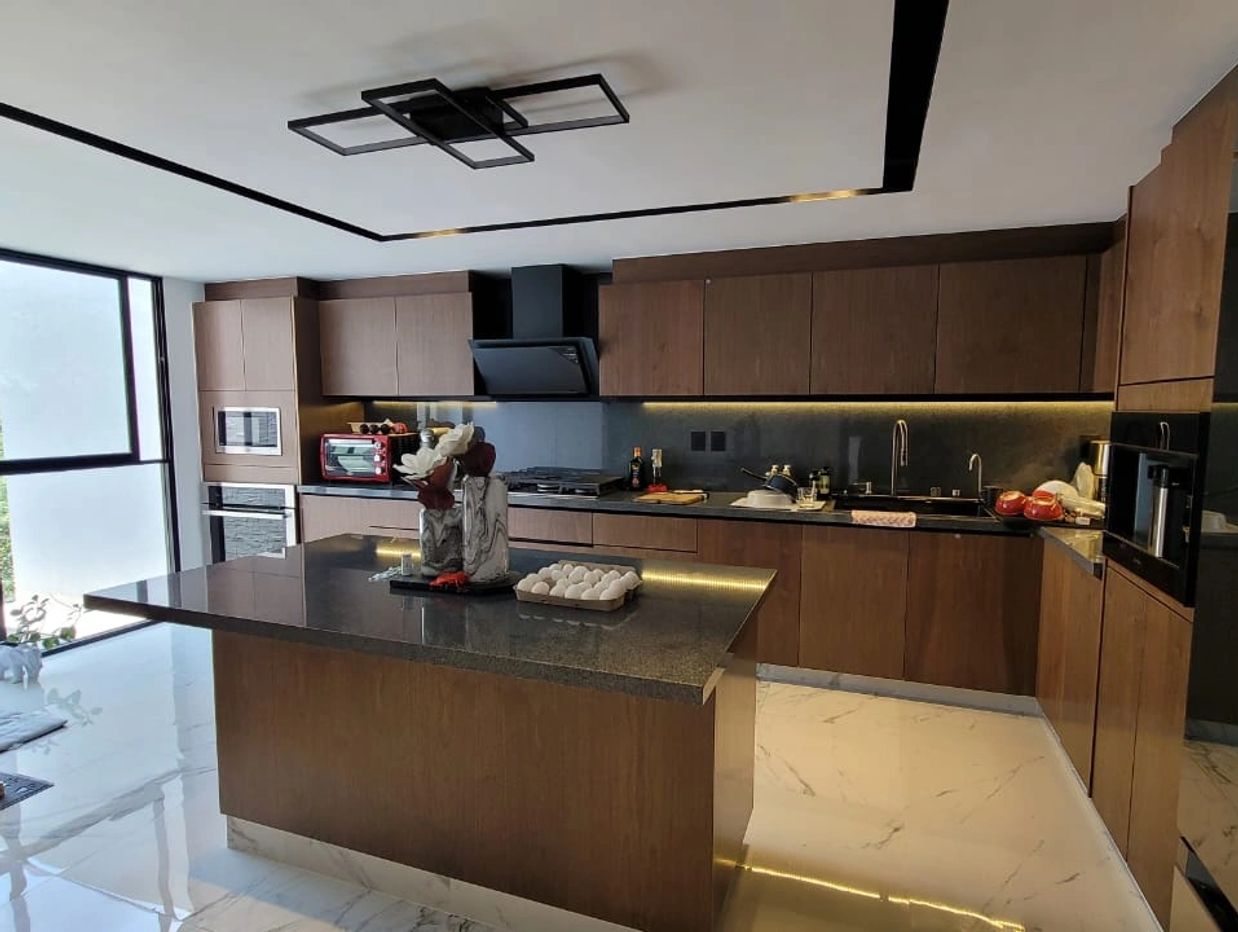 Este mueble integral de cocina combina almacenamiento, funcionalidad y diseño en un solo elemento. Su acabado en chapa natural de madera sobre estructura de MDF brinda un toque cálido y elegante, ideal para espacios contemporáneos. La distribución en “L” con isla central maximiza el flujo de trabajo, mientras que la cubierta de granito negro añade durabilidad y sofisticación. Además, cuenta con electrodomésticos empotrados que optimizan el espacio sin sacrificar la estética.